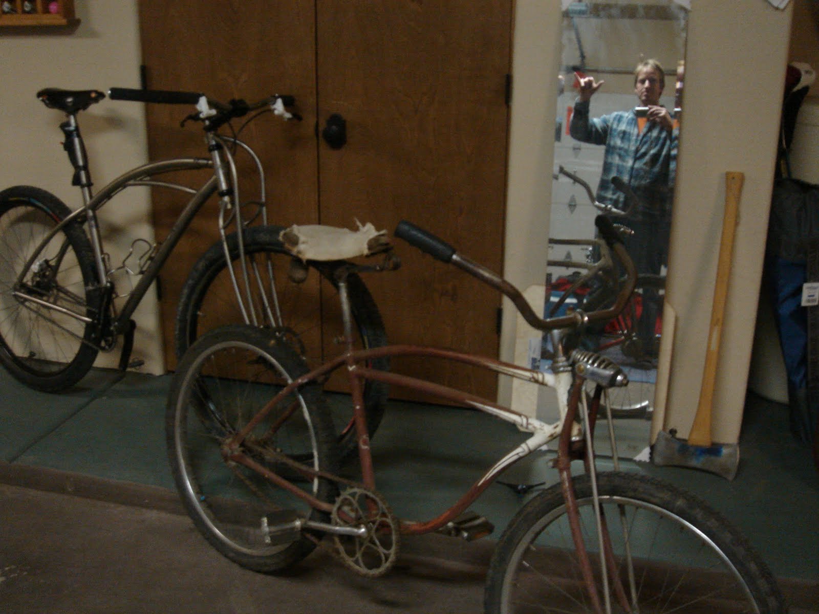 I thought it would be a good history lesson to add in a picture of my dad’s 1940 Schwinn World. (Of course I have all rights to the bike now.) The dude, Theodore Rohwer, acquired this bike when he was 8 years old. Yes! 8 years old. Look at the chainring on this beast. It weighs in at 42 lbs. My dad doesn’t understand my addiction to titanium Black Sheep. He doesn’t understand the desire to have a sub 20 lb single speed. Back in the day young Theodore rode this 42 lb beast all over Iowa. (His sister had/has one too!) Young Theodore was so small when he got this bike he would place the bike in a gutter and get on while standing on a curb.