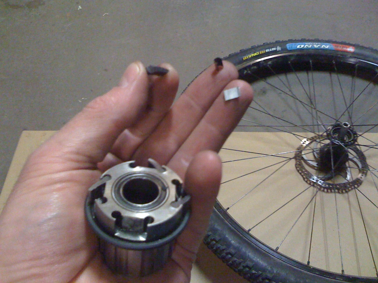 This is the pawl and busted spring removed from the freehub / pawl / spring assembly.