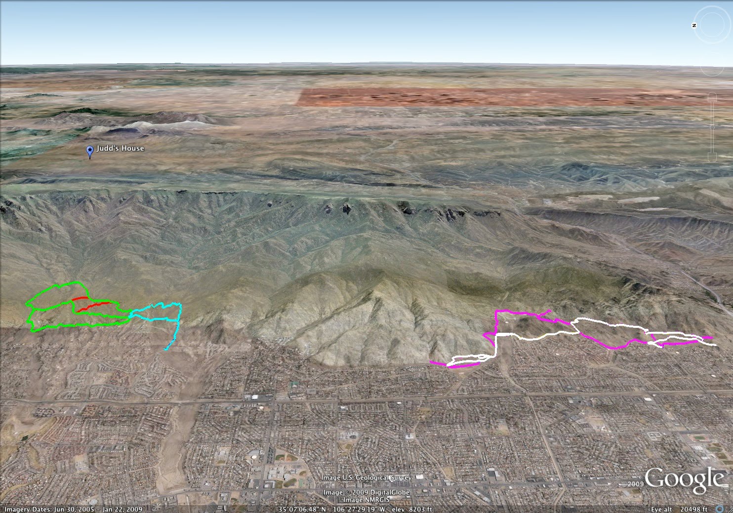 Working through the monotony was a major challenge. 80 miles in the foothills requires many, many loops. Oh well. Beats sitting on the couch, I think. Check out my house, just a short distance from the trails, but 10,678′ Sandia Peak creates an obstacle. Anyone want to hang out? Bring beer, I’ll supply the Cheetos.