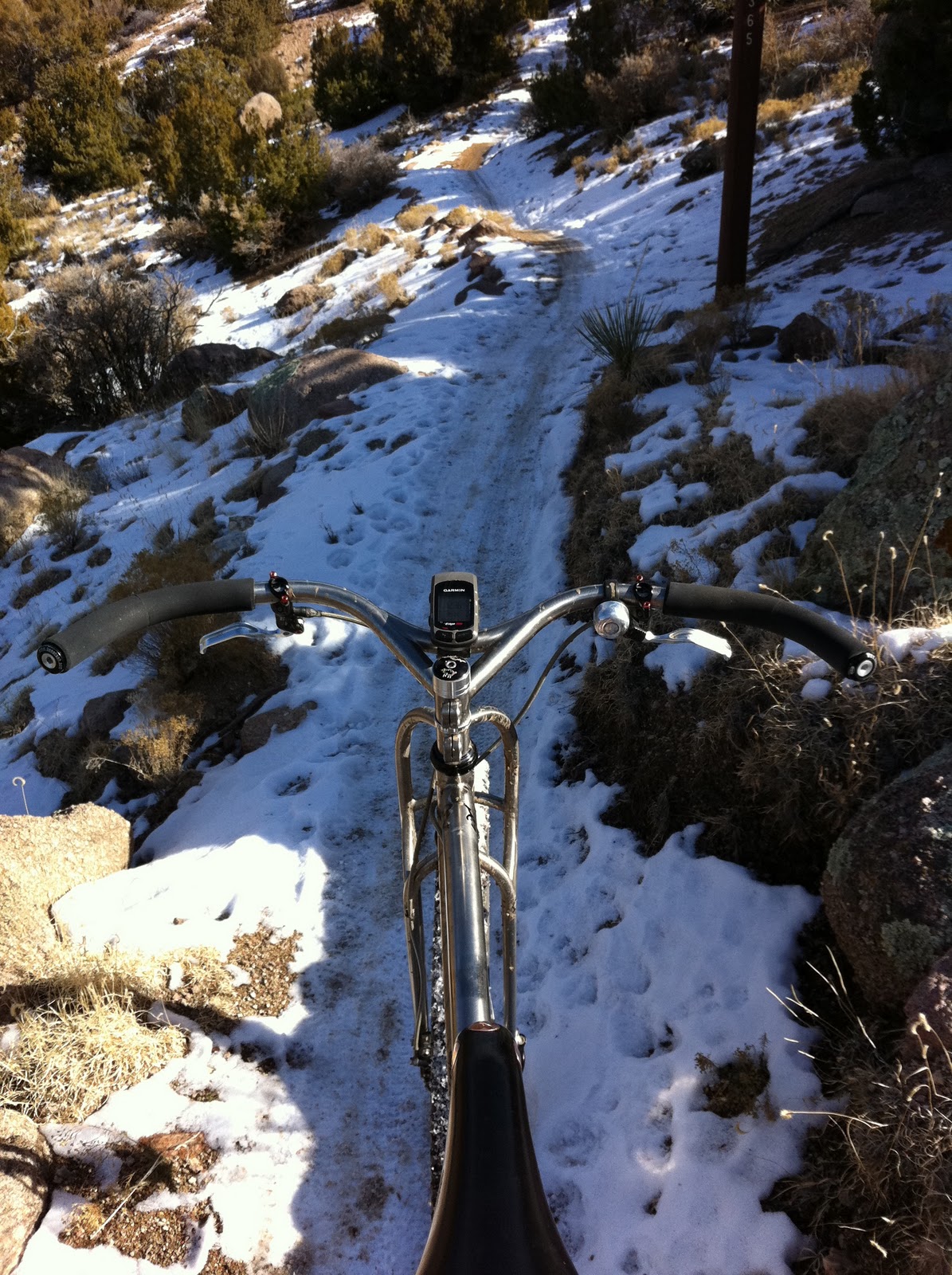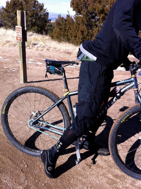 I had a interesting encounter with Prob-eee on Saturday. I was up cruising the Geriatric Loops in the North Foothills and ran into Prob-eee. (Why was I cruising the Geriatric Loops? Well, I was looking for Prob-eee, he hangs on those easy trails.) Anyway, I was thinking about Prob-eee, wondering what type of snow suit he would be wearing on such a ‘cold’ day. Well, check out this pic. Prob-eee has on a massive fleece sweater, neoprene bootie covers, a wool hat (not in the pic) and I believe he was wearing some type of mittens. Yeah, it was like 45 degrees too. Insane. AND check out that cute fanny pack. Amazing.