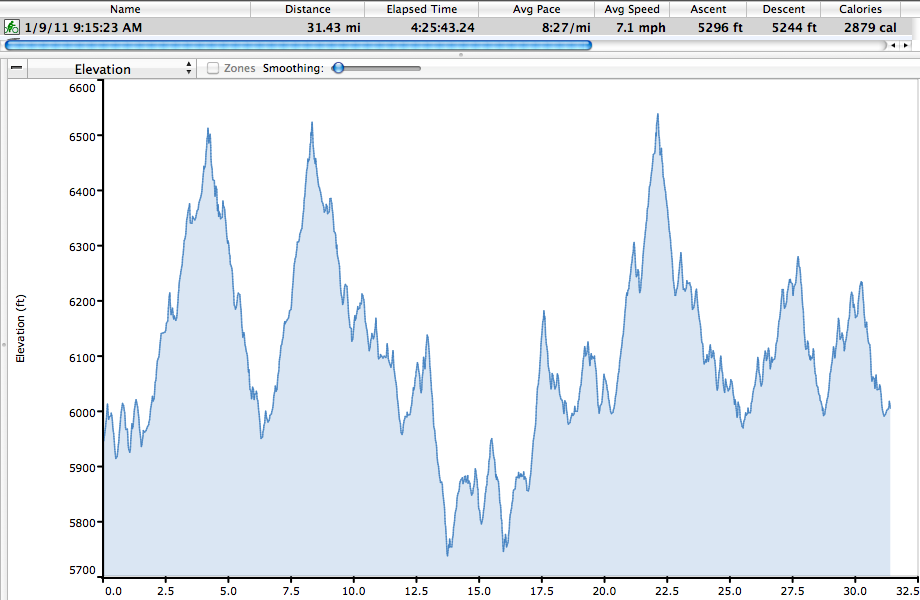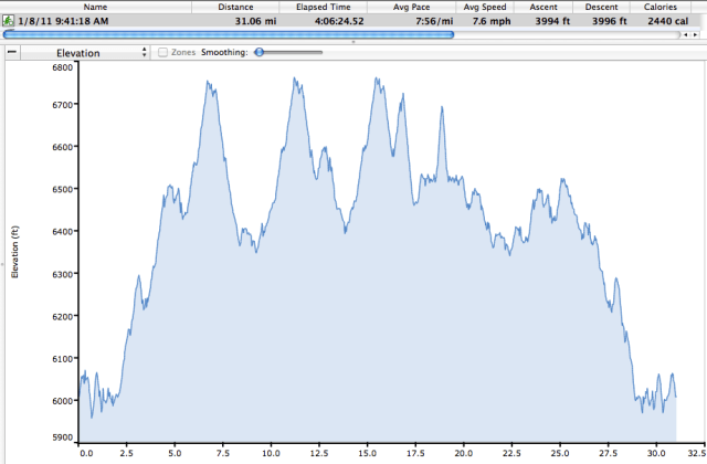 Check out this data from the Geriatric Loops. 31 miles and 3994 Vertical. AND I climbed about 600 feet on my way up to the North Foothills. So. It’s a pretty tame ride.