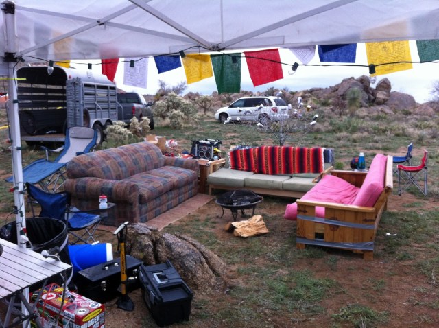The BPR Compound at 24 Hours in the Old Pueblo was All Time! Three couches, stereo, coffee table, end table, living room carpet, fireplace, disco ball, lava lamp, a couple spare bedrooms and an outhouse with an awesome view.