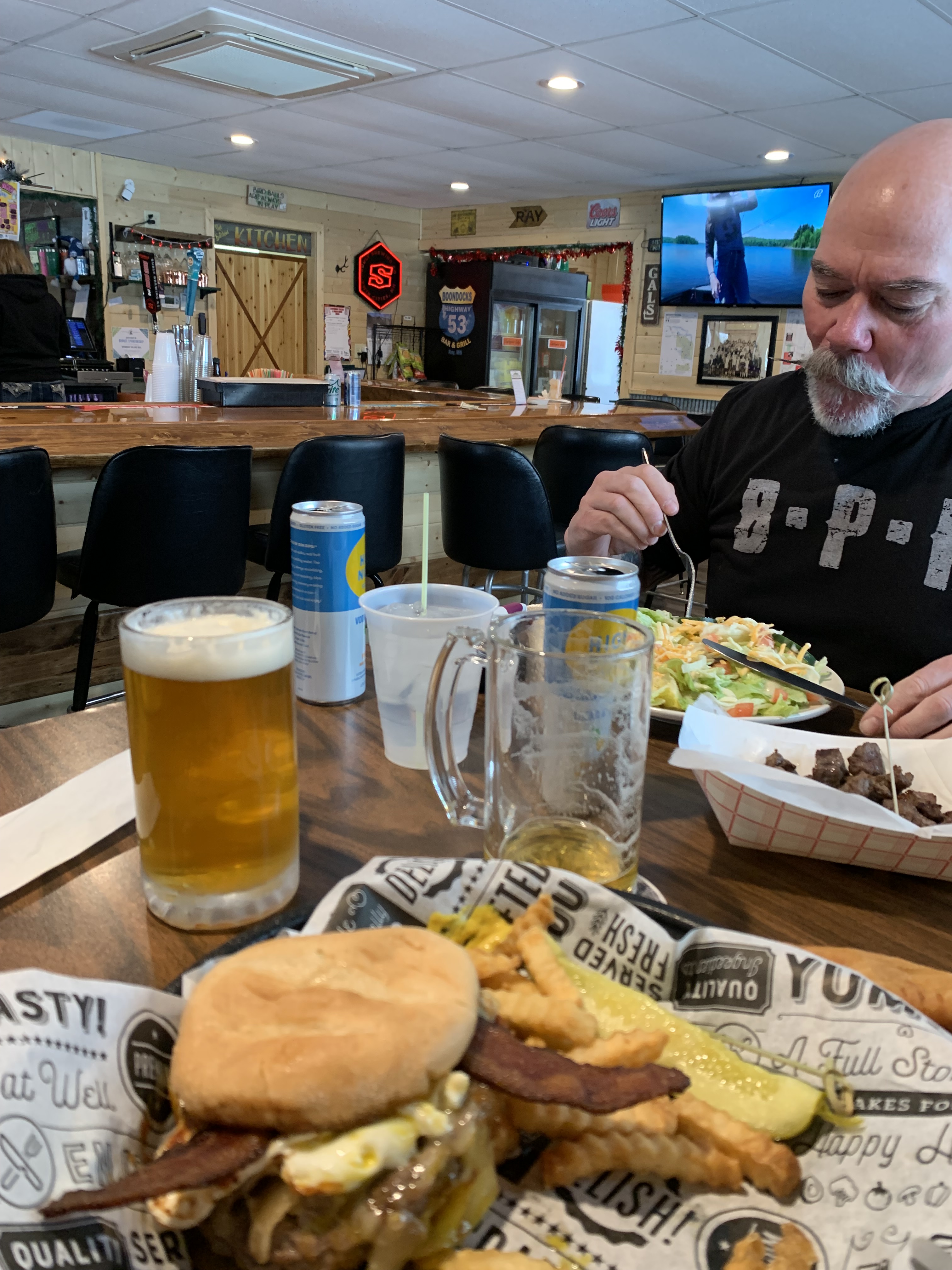 So. We couldn’t find The Pagan this year. We circled around everywhere. Then we finally found a pizza joint that is now where The Pagan was. Weird. Then ‘shit hit the fan’ as two Sausage McMuffin’s with egg won the battle with the Preachers Insides. So. After 4 McMuffin puke sessions there became a desperate need to find a ‘purge’ room. So. We pulled into a ‘pizza parlor’ near the train tracks in Superior and…. The old Pizza Parlor is the New Thirsty Pagan. And the old Pagan is a new pizza parlor. No joke. It’s the Matrix… At The Back of the Pack.